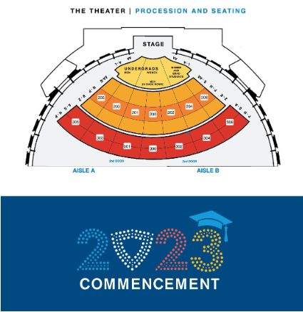 The graduates will be sitting in the front of the theater, at the base of the stage.  The women graduates will be seated on the right side and the men graduates will be seated on the left side of the venue.