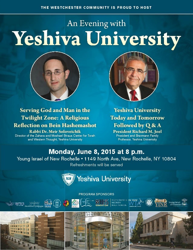 The Westchester Jewish community will host “An Evening with Yeshiva University,” on Monday, June 8, at 8 p.m., at the Young Israel of New Rochelle, 1149 North Avenue, New Rochelle, New York 10804.