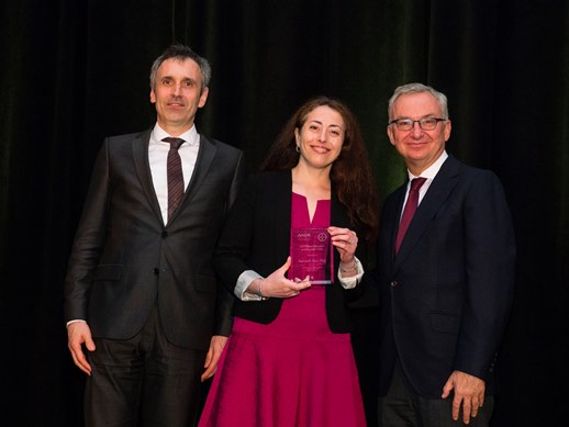 Dr. Marina Holz with Dr. Karl Ziegelbauer, left, and Dr. José Baselga, right. (AACR/Todd Buchanan 2016)Dr. Marina Holz, Doris and Dr. Ira Kukin Chair in Biology, received the American Association for Cancer Research (AACR) Bayer Innovation and Discovery Grant to study a form of triple-negative breast cancer.