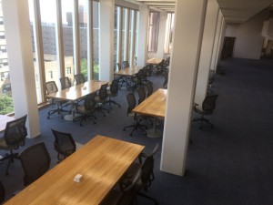 Renovated 5th floor of Gottesman Library Building featuring curtain wall along Amsterdam Avenue, refinished table tops with integral power, new caster chairs, and improved lighting.