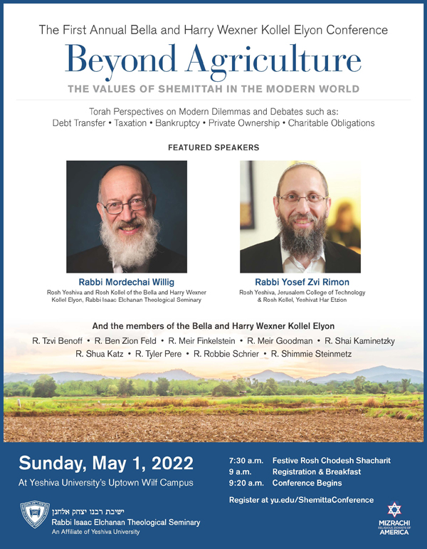 On Sunday, May 1, 2022, the Rabbi Isaac Elchanan Theological Seminary (RIETS), in collaboration with Mizrachi America, hosted the inaugural Bella and Harry Wexner Kollel Elyon Conference. Titled “Beyond Agriculture: The Values of Shemittah in the Modern World,this year’s Bella and Harry Wexner Kollel Elyon Confernce conference, was introduced by President Dr. Ari Berman and graced with remarks by Susan Wexner. Keynote addresses were presented by Rabbi Mordechai Willig (Rosh Yeshiva and Rosh Kollel of the Bella and Harry Wexner Kollel Elyon) and Rabbi Yosef Zvi Rimon (Rosh Yeshiva, Jerusalem College of Technology amd Rosh Kollel, Yeshivat Har Etzion).