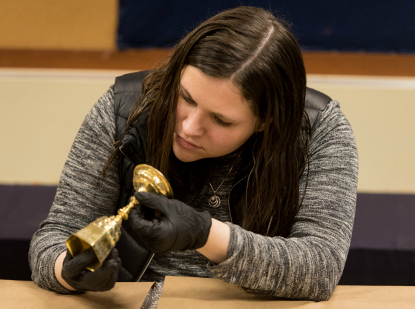 Museum Education Course, hosted at the YUM Hedva Tirschwell examines a wedding goblet.