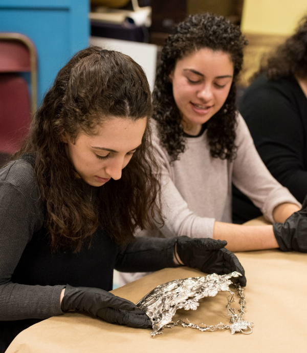 Museum Education Course, hosted at the YUM Tova Hirt and Bethia Gindi examine a silver Torah crown.