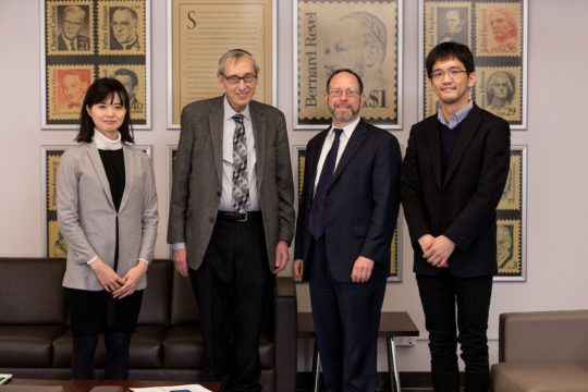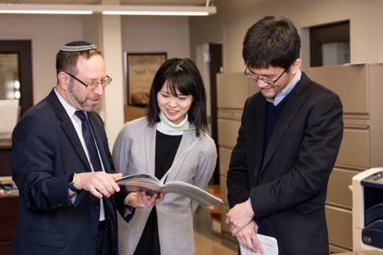 On March 22, two Japanese scholars of Judaic studies visited with faculty at Yeshiva University's Bernard Revel Graduate School of Jewish Studies to discuss their research and the state of Jewish studies in Japan. The scholars--Dr. Masahiro Shida and Mina Lee--originally met with Dr. Mordechai Cohen, associate dean of Revel, at the World Congress of Jewish Studies in Jerusalem last summer.