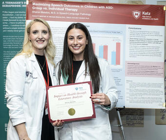 At the recent Graduate Symposium on Science, Technology and Health, Sharon Matalon, a student in the M.S. in Speech-Language Pathology, presented findings that could reshape how clinicians approach articulation therapy for children with Autism Spectrum Disorder (ASD). Her research, “Maximizing Speech Outcomes in Children with ASD: Group vs. Individual Therapy,” tackles a vital question in speech-language pathology: Can group therapy be just as effective as individual therapy, and under what circumstances?