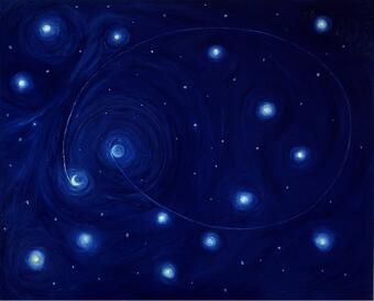 Edward Belbruno’s painting, Route  to the Moon, was on display at the conference. It illustrates the rescue trajectory of the Japanese spacecraft Hiten, which he designed in 1991 using his research on low-energy transfer pathways to the Moon. The artwork was created when Hiten was midway along its five-month transit. At that stage, mission success was uncertain, since the dynamics of low-energy orbits were still largely untested in spaceflight. The spacecraft ultimately achieved lunar capture in October 1991, validating the approach. In the painting, stellar fields are represented as abstract luminous forms, while the transfer trajectory is depicted as a thin white curve extending from Earth, located at the lower left, to the Moon, rendered as a yellow crescent.
