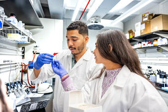 In Dr. Irina Catrina's lab, Andres Romero, left, and Rutu Jagtap, both students in the Katz School's M.S. in Biotechnology Management and Entrepreneurship, explored how synthetic molecules called peptide nucleic acids—or PNAs—could help scientists better track and control messenger RNA.