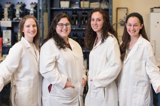 From left to right, recent Stern alumni who will pursue doctoral degrees in scientific research fields: Adina Wakschlag, Nili Greenberg, Adi Berman and Maya Tsarfati. Not pictured: Ayala Carl.