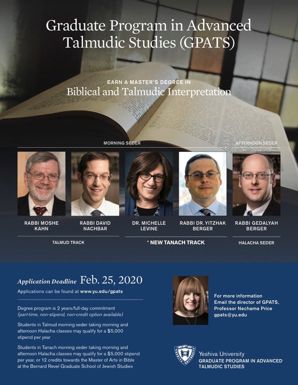 Applications for the 2020-2021 year are due February 25, 2020. For more information, email the director of GPATS, Professor Nechama Price at gpats@yu.edu