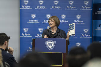 The Sy Syms School of Business hosted an engaging fireside chat last month featuring Marcy Syms, president of the Sy Syms Foundation and member of the School’s Board of Overseers. The event brought together students, faculty, alumni and others from the university for an in-depth discussion on leadership, ethics, and the legacy of the SYMS retail clothing brand founded by her father, Mr. Sy Syms A"H.