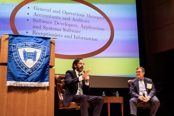 The conversation then turned to the issue many in the audience cared about most: employment. Hernandez-Lagos summarized current research on AI and jobs. “So far, the overall effect is very small,” he said. “Some entry-level positions, such as accounting, software development and clerical roles, are more exposed to automation, but the impact is limited.”