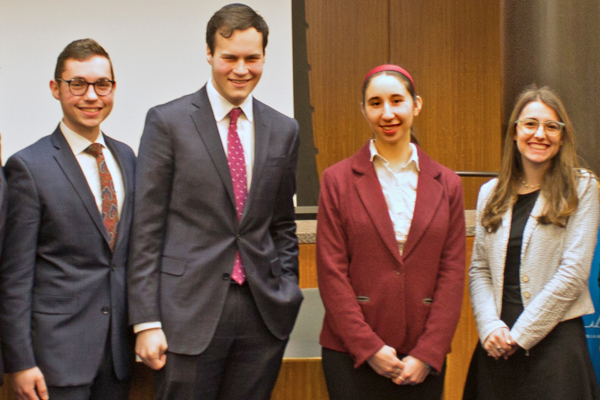 At the conclusion of each five-minute argument, the judges individually offered contestants detailed critiques of their speeches, with an eye toward helping them hone their rhetorical and analytical abilities. Capturing first place were Jonah Loskove ’22SB and Shayna Doretsky ’20S; Rachel Rosenberg ’20S placed second and Israel Fruchter ’22YC ranked third.