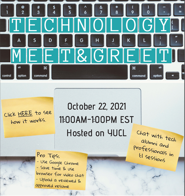 Rounding out the week, on Friday, Oct. 22, 2021, from 11 a.m. to 1 p.m., was the Technology Meet and Greet, where, as the name of the event implies, students had the opportunity to network with alumni and professionals at a number of leading tech firms.