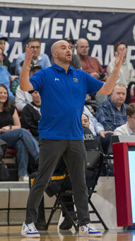 Coach Elliot Steinmetz reacts during the Macs’ victory over the University of Maine-Farmington.