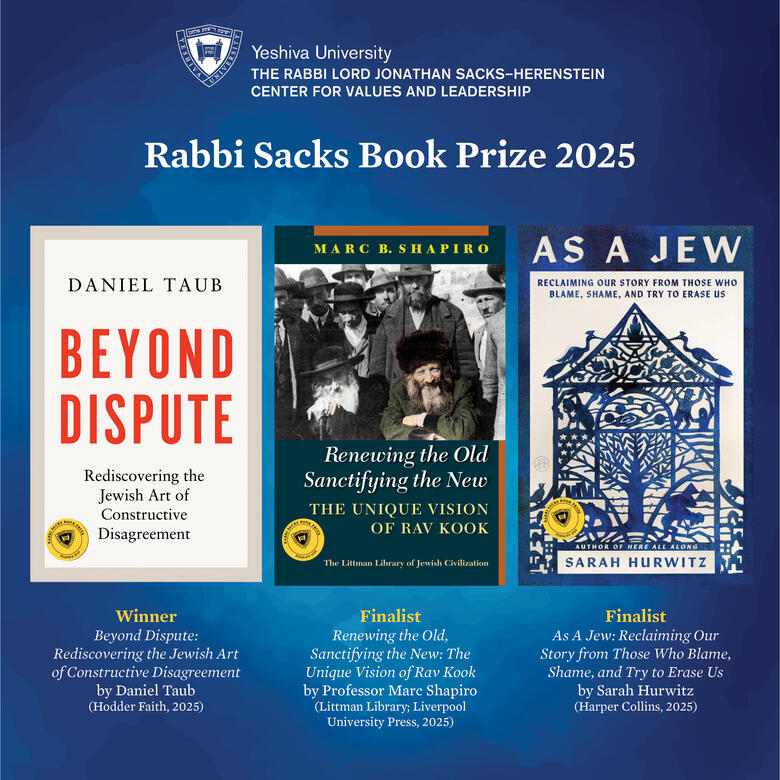 The Rabbi Sacks Book Prize Artificial Intelligence Biotechnology Computer Science Cybersecurity Data Analytics and Visualization Digital Marketing and Media Mathematics Occupational Therapy Physician Assistant Physics Speech-Language Pathology Rabbi Sacks Book Prize 2025The Sacks-Herenstein Center is thrilled to announce the winner and finalists of the Rabbi Sacks Book Prize 2025. Winner: Beyond Dispute: Rediscovering the Jewish Art of Constructive Disagreement (Hodder Faith) by Daniel Taub To listen to a podcast conversation between Dr. Shira Weiss and Daniel Taub, click here.The book is available for purchase here. Finalist: Renewing the Old, Sanctifying the New: The Unique Vision of Rav Kook (Littman Library of Jewish Civilization) by Dr. Marc ShapiroTo listen to a podcast conversation between Dr. Shira Weiss and Professor Marc Shapiro, click here.The book is available for purchase here.Finalist: As a Jew: Reclaiming Our Story from Those Who Blame, Shame, and Try to Erase Us (HarperOne) by Sarah HurwitzThe book is available for purchase here. Winner: The Madwoman in the Rabbi's Attic: Rereading the Women of the Talmud by Gila Fine To listen to a podcast conversation between Dr. Shira Weiss and Gila Fine, click here.The book is available for purchase through Amazon and Koren. Finalist: Ethics of our Fighters: A Jewish View on War and Morality by Shlomo Brody To listen to a podcast conversation between Dr. Shira Weiss and Rabbi Dr. Shlomo Brody, click here.The book is available for purchase through Amazon and Koren.Finalist: Human-Divine Interactions in the Hebrew Scriptures: Covenants and Cross-Purposes by Berel Dov LernerTo listen to a podcast conversation between Dr. Shira Weiss and Dr. Berel Dov Lerner, click here.The book is available for purchase through Amazon and Routledge. Winner: Impossible Takes Longer: 75 Years After Its Creation, Has Israel Fulfilled Its Founders' Dreams? (Ecco, 2023) Dr. Daniel Gordis .Dr. Daniel Gordis, Koret Distinguished Fellow at Shalem College, assesses how Israel measures up against its founders’ aspirations in Israel's Declaration of Independence. He discusses reasons for the establishment of the State, the flourishing Jewish and Israeli culture, the nation's economy, the Israeli-Arab conflict, the distinct form of Judaism that has emerged, and the nation's complex relationship with the Diaspora.To listen to a podcast conversation between Dr. Shira Weiss and Dr. Daniel Gordis, click here.To purchase the book, click here.Finalist: Questioning Belief: Torah and Tradition in an Age of Doubt (Koren, 2023) by Rabbi Dr. Raphael Zarum, Dean of the London School of Jewish Studies. Rabbi Dr. Zarum presents thorough, reasoned responses, based on Torah and tradition, to some of Judaism's most challenging questions of belief, science and ethics.To listen to a podcast conversation between Dr. Shira Weiss and Rabbi Dr. Raphael Zarum, click here.To purchase the book, click here.Finalist: Covenant and World Religions: Irving Greenberg, Jonathan Sacks and the Quest for Orthodox Pluralism (The Littman Library of Jewish Civilization in association with Liverpool University Press, 2023) by Rabbi Dr. Alon Goshen-Gottstein, Founder and Director of the Elijah Interfaith Institute. Rabbi Dr. Goshen-Gottstein analyzes the theological and social views of Rabbi Sacks and Rabbi Greenberg, as they advocated to change how Judaism sees world religions.To listen to a podcast conversation between Dr. Shira Weiss and Rabbi Dr. Alon Goshen-Gottstein, click here.To purchase the book, click here. (discount code ADISTA5) Winner: Becoming Elijah: Prophet of Transformation (Yale University Press, 2022) by Professor Daniel Matt.A volume in Yale University Press’ Jewish Lives Series, Becoming Elijah traces how depictions of the prophet transform from the Bible to Rabbinic Judaism, Kabbalah and Jewish ritual. In a sophisticated, yet accessible manner, Matt, a scholar of Kabbalah, brings the prophet to life as he comprehensively chronicles the diverse references to Elijah from history and faith traditions. He explains how Elijah fills a need for hope and for justice; though his identity is variable, it is shaped by an ethical imperative that continues to inspire. To listen to a podcast conversation between Dr. Shira Weiss and Professor Daniel Matt about Becoming Elijah, click here. To purchase the book click here. Finalist: A Guide for the Jewish Undecided: A Philosopher Makes the Case for Orthodox Judaism (Koren, 2022) by Professor Sam Lebens. To listen to a podcast conversation between Dr. Shira Weiss and Professor Sam Lebens about A Guide for the Jewish Undecided, click here. To purchase the book click here.Finalist: Care and Covenant: A Jewish Bioethic of Responsibility (Georgetown University Press, 2022) by Rabbi Dr. Jason Weiner. To listen to a podcast conversation between Dr. Shira Weiss and Rabbi Dr. Jason Weiner about Care and Covenant: A Jewish Bioethic of Responsibility, click here.To purchase the book click here.We congratulate all authors whose books, diverse in genre and style, make impactful contributions to the field of contemporary Jewish thought. BOOK EVENTS From Darkness to Light: Israel the Day After Dr. Daniel Gordis Click here to watch the recording of the event. From Darkness to Light: Israel the Day After Negotiating the Impossible: The Israeli Hostage Crisis Dr. Daniel Gordis Click here to watch the recording of the event. Negotiating the Impossible: The Israeli Hostage Crisis From Darkness to Light: Israel the Day After Dr. Daniel Gordis Click here to watch the recording of the event. From Darkness to Light: Israel the Day After Negotiating the Impossible: The Israeli Hostage Crisis Dr. Daniel Gordis Click here to watch the recording of the event. Negotiating the Impossible: The Israeli Hostage Crisis