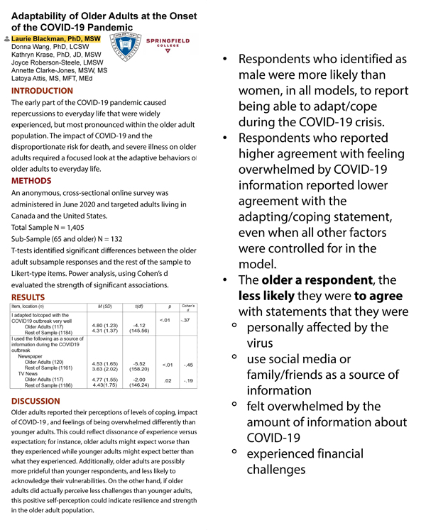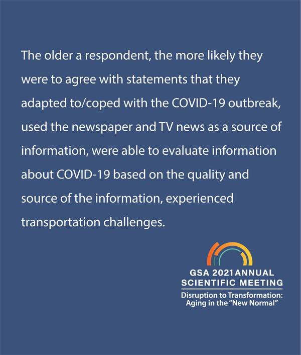 Titled “Adaptability of Older Adults at the Onset of the COVID-19 Pandemic,” the data presented in the poster led to the conclusion that “the older a respondent, the more likely they were to agree with statements that they adapted to/coped with the COVID-19 outbreak, used the newspaper and TV news as a source of information, were able to evaluate information about COVID-19 based on the quality and source of the information, [and] experienced transportation challenges.”
